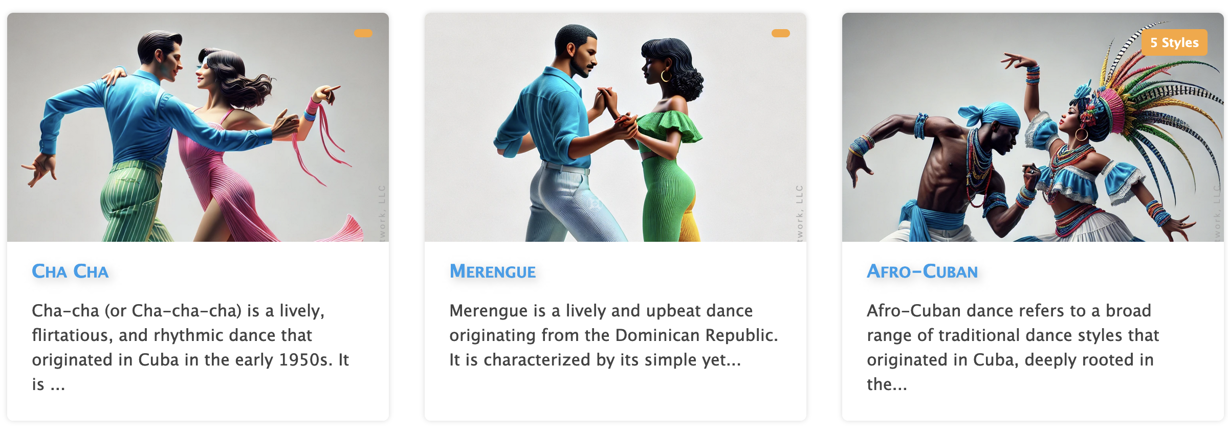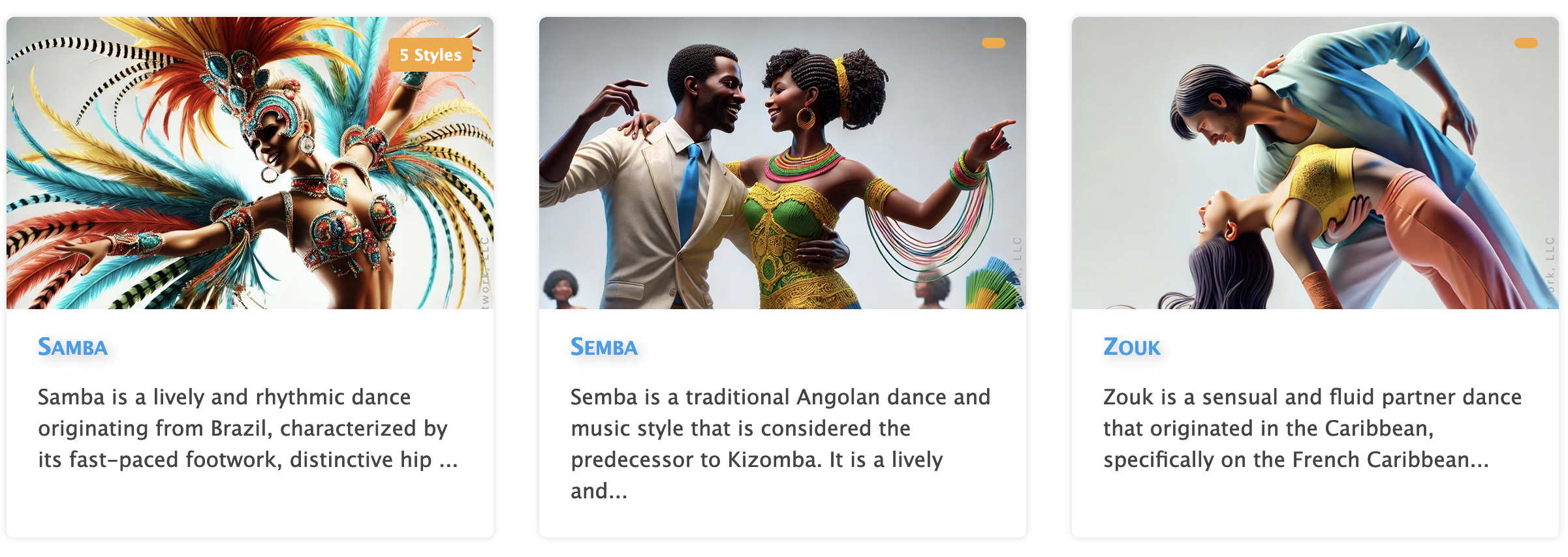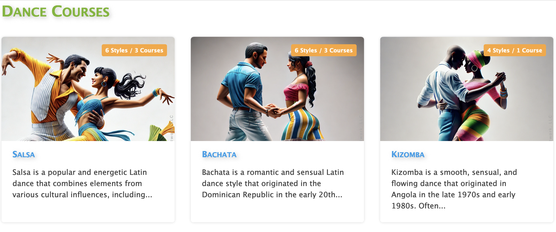 You can create courses teaching dance steps, techniques, musicality on beginner, intermediate and advanced levels. Below are the current dance styles available: